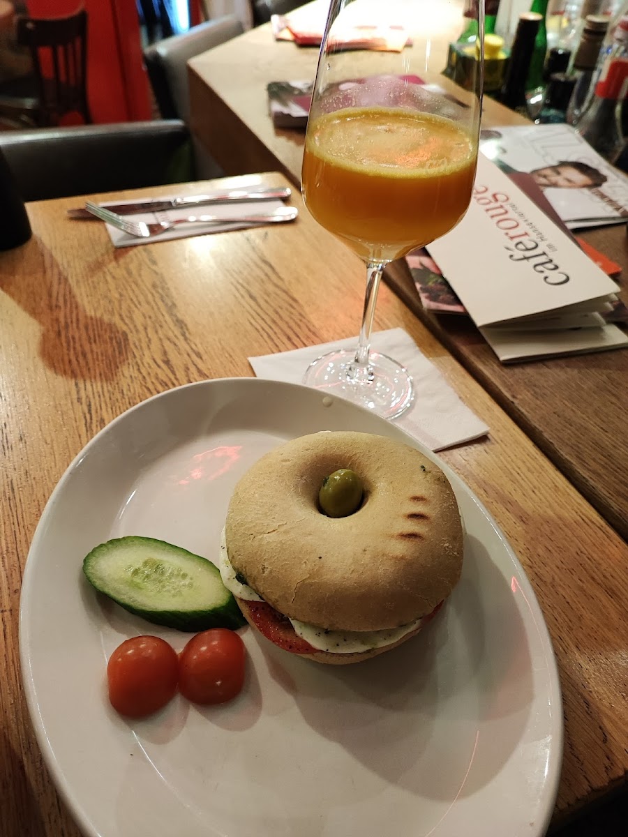 CAFE ROUGE prides itself on offering an extensive and diverse menu that caters to various tastes. For a satisfying lunch, you must try the Chicken Burst, a dish that promises to delight your palate with its flavors. If you have an adventurous spirit, Billy B. suggests ordering the lasagne, which he lauds as "the best thing I've eaten in my life." The café also features comforting classics like tomaten creme suppe and spiegelei mit schinken, perfect for those chilly Hamburg afternoons.